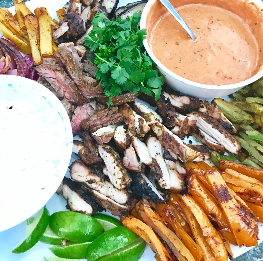 - Once your steak if cooked, take two lime halves and squeeze one half directly over the steak, and the other half squeezed directly over the chicken. Place your thighs, vegetables, and steak back onto your sheet tray, and transfer to a cutting board. Beginning with your vegetables, slice your peppers and onions into the traditional strips for fajitas. Repeat these steps with your chicken, and then finally your steak. Arrange your meats and vegetables on a platter with your crema. Serve with rice, lime wedges, extra cilantro, and tortillas. We served ours with all the trimmings and accoutrements, including queso.