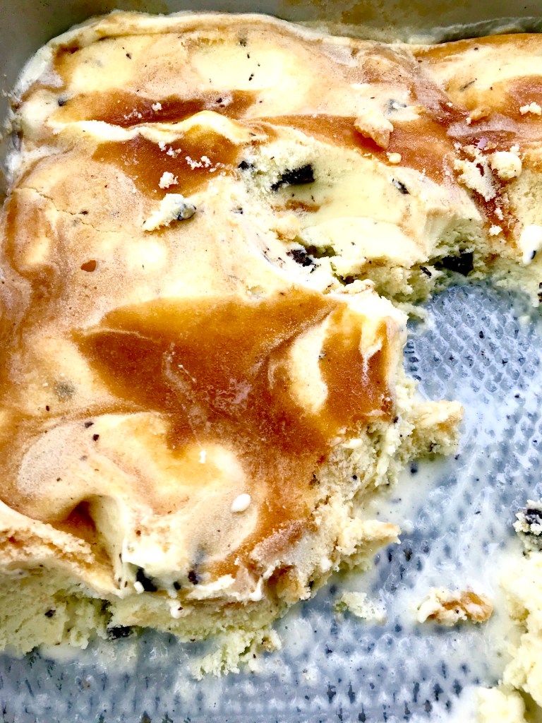 - Once churned, pour your base into your prepared, chilled pan. Take your peach mixture out of the fridge and, working one tablespoonful at a time, gently depress the back of your spoon into your ice cream until you feel the back of the spoon hit the bottom of your dish. Tilt the spoon gently to pour the peach mixture into the depression you made in your ice cream base. Make as many depressions in your ice cream as you’d like (we did three rows of three for a total of 9). Using your spoon, or a butter knife, quickly swirl your peach mixture into your base to create a marbling effect. Return the ice cream mixture to the fridge to chill completely; 2-3 hours before serving.