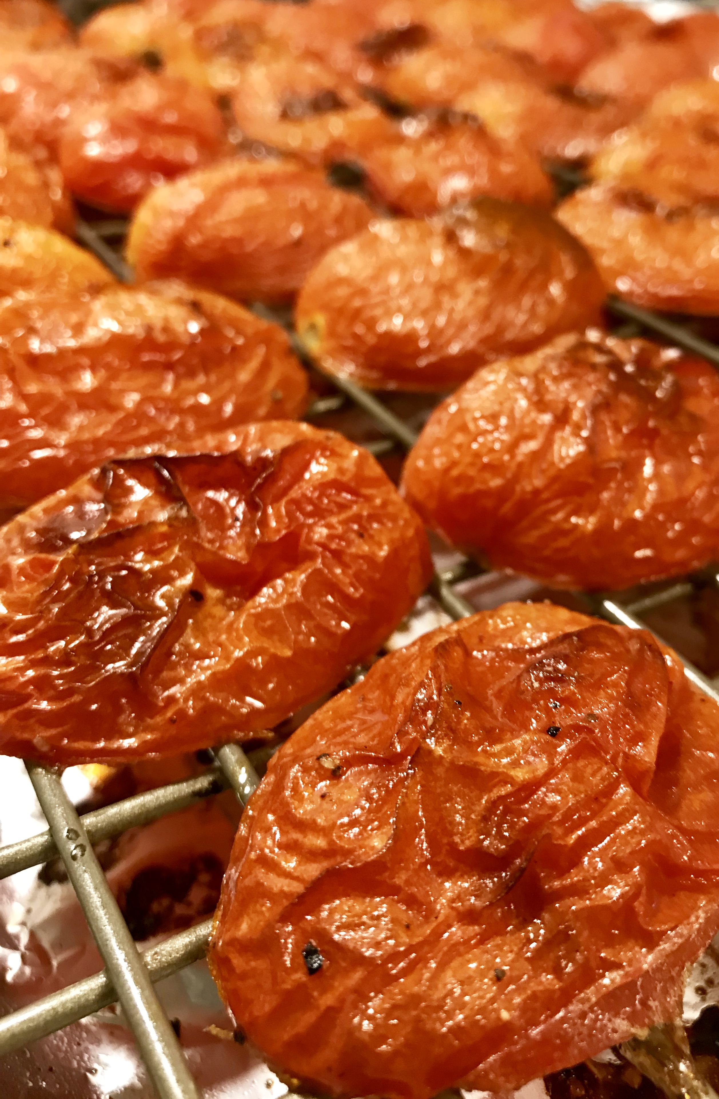 - After an additional 30 minutes, remove your tomatoes from the oven, and flip each tomato so the cut side is now facing up. Once you’ve flipped all tomatoes over, and their cut sides are facing up, continue to roast at 300-275 degrees until tomatoes are visibly darkened, and dried (3-4 hours). Rotate, your tray(s) at the 1.5/2 hour mark.