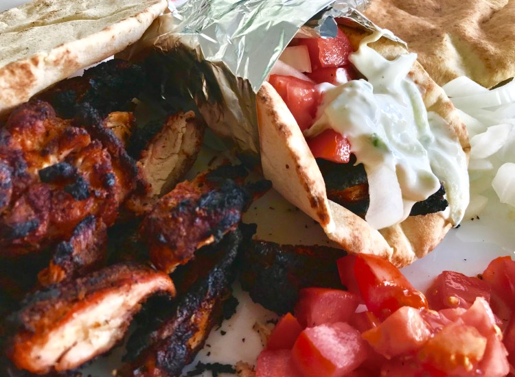 - To build a Gyro begin by placing 1-2 tablespoons of Tzatziki onto a warmed pita. Place your grilled chicken over your Tzatziki and garnish with feta, sliced onions, tomatoes, additional Tzatziki and, if you’re feeling extra Cheffy, fried potatoes.