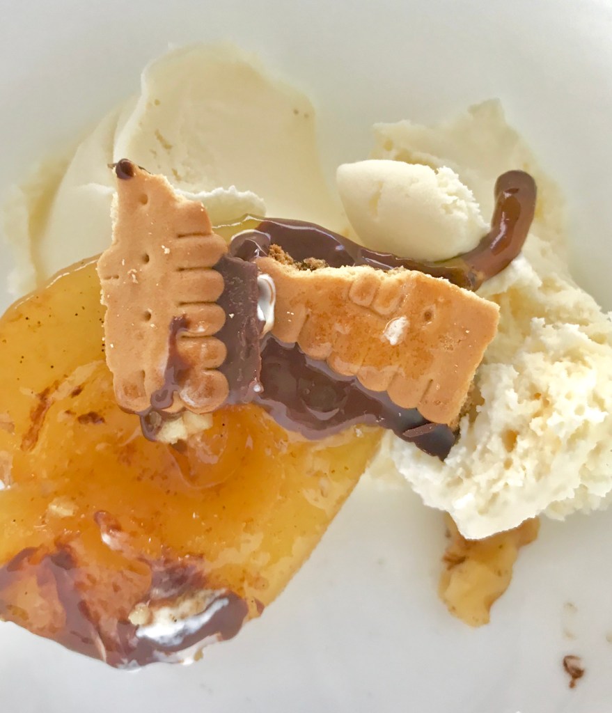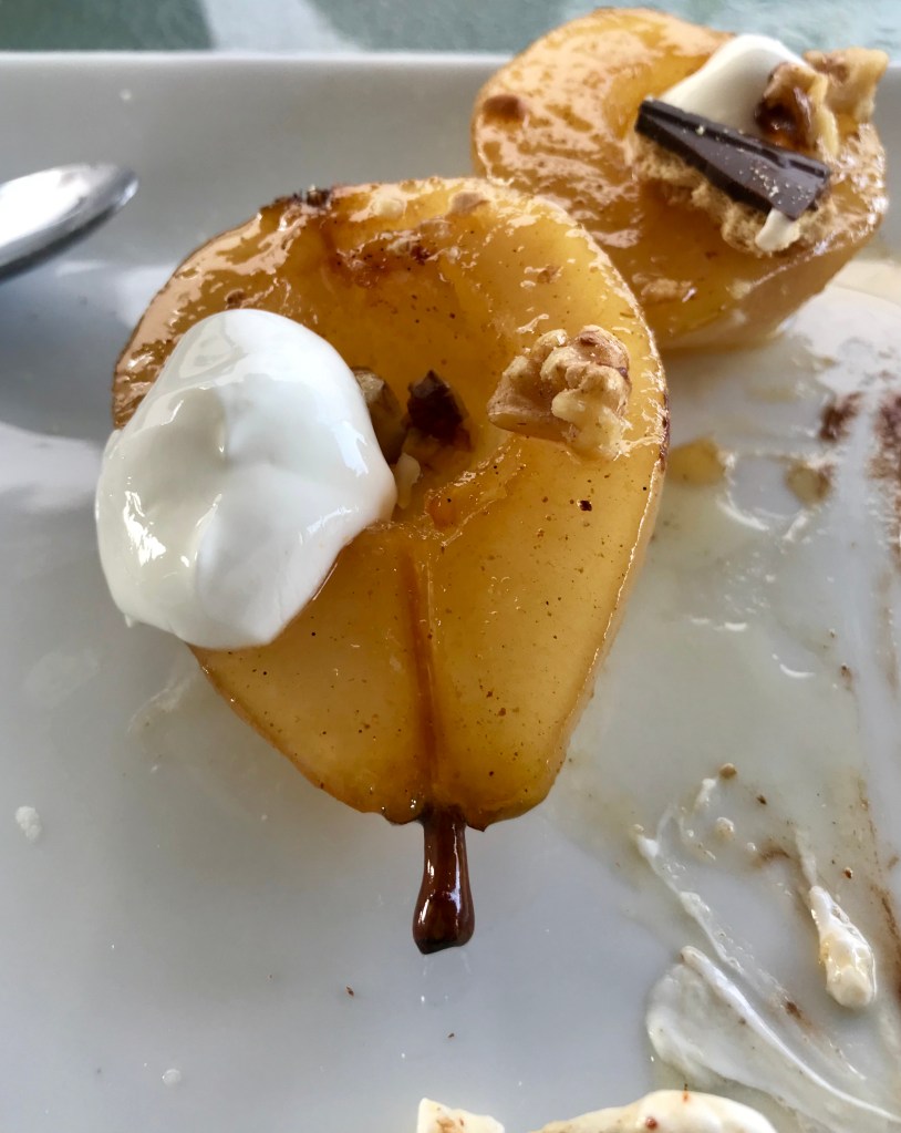 GET CHEEFY TIP!- The proportions of sugar, butter, etc., and the cooking times listed below are all variable to how ripe your fruit is, and how sweet you’d like this dessert. The pears we used were fairly underripe (they would have been firm, and had resistance under our teeth if eaten raw), so our cooking time was roughly 20-30 minutes; if the pears you use are ripe to overripe, they may need as little as 5-10 minutes to cook until soft. Er on the side “overcooking” your pears as you, and your guests, will have to be able to get through them with a spoon.