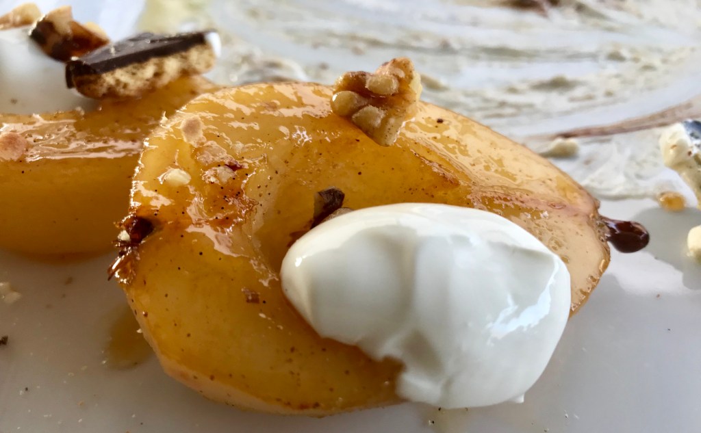 - Before you begin, start by tasting a piece from one of your pears; gauge how sweet, and ripe they are before proceeding (following the Get Cheffy guidelines mentioned above). Once you’ve tasted your fruit, and understood how long a cooking time, and how much sugar, they might need, begin to brown your pear halves. In a non-stick skillet, heat your two tablespoons butter over medium/medium-high heat until melted. Add your pears, cut side down, to the pan, and allow to cook over medium/medium-high heat for 5-10 minutes. Adjust your heat as needed, but you’re looking to achieve a browned/lightly-seared exterior on the cut side of the pears. Flip one of the pears over at the 5 minute mark, and check your progress (and adjust your heat as needed). After 5-10 minutes searing, add 1-2 tablespoons of sugar to the pan and allow to melt into the heated butter (30 seconds). Add your 2 cups of wine, water, or juice and pinch of table salt, and bring to a boil before covering, and reducing your heat to a simmer. Depending on the ripeness of the fruit you’re using, your pears could take 5-20 minutes of additional cooking time. After 5-10 minutes on simmer, gently press one of the pears with the back of a butter knife; the butter knife will easily slide in/out with no resistance when your pears are cooked. Once your pears are cooked, remove the lid from the pot, and allow your sauce to reduce, uncovered. After 5 minutes, lower your heat to a gentle simmer and notice the color of the poaching liquid; as you near the end of cooking time, you’ll begin to see the color of the sauce darken as the sugar caramelizes. Once your sauce has reduced, and turned a dark amber color, gently remove your pears and place them on your serving platter. With your heat still on low, add your cream and gently swirl to combine with your caramelized poaching liquid. Caramelized sugar will bubble up violently when you add liquid to it…..be mindful when adding your cream, and allow the bubbles to subside (5-10 seconds) before swirling to combine. Allow to heat on low for 1-2 minutes. Place a pear half into individual bowls of vanilla ice cream, and spoon sauce over pear halves. Garnish with walnuts, cookies, sour cream, and serve.