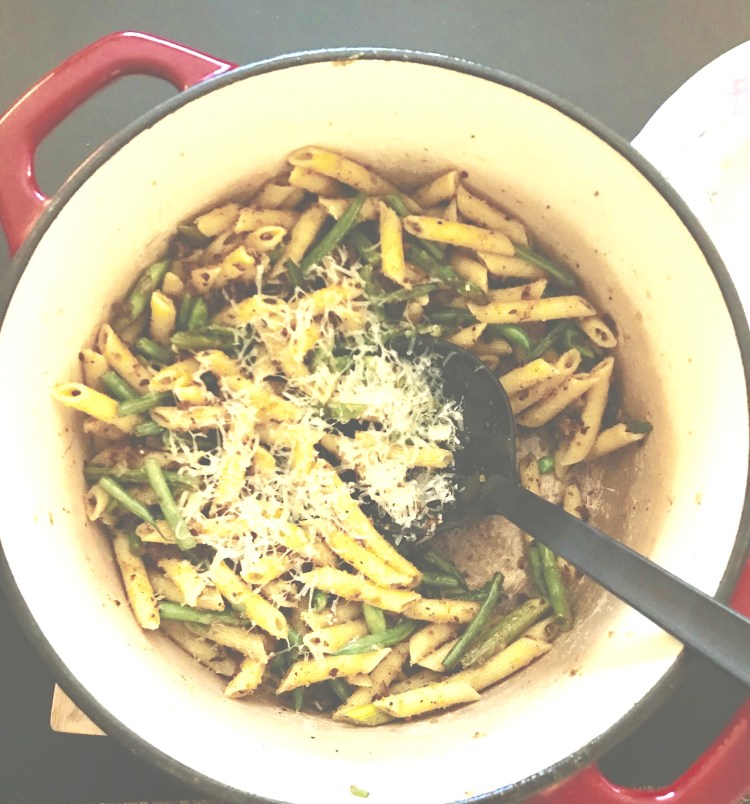 - Wipe out your skillet with a paper towel, if need be, and add your 2 tablespoons of butter over medium/high heat. While your butter melts, bring 4 quarts of water with 1/2 tablespoon table salt to a boil in a large cast iron dutch oven. While you’re waiting for your water to boil, begin sautéing your minced scallion whites/light-greens in butter over medium low heat (keep the darker green scallion portion set to the side until later). After 2-3 minutes stirring occasionally over medium to medium/high heat, add your minced garlic, ~1/2 teaspoon ground black pepper, and ~1/2 teaspoon of table salt and cook for another minute. Add your rinsed and chopped green beans and asparagus and stir to combine. Continue to cook over medium to medium-high heat adjusting your burner as needed. These vegetables won’t release much, if any, moisture as they cook, so lower your heat, and don’t be afraid to add a few tablespoons of water/white wine if your vegetables are going too quickly. Continue to cook until al dente (4-7 minutes) and turn off your burners. Add your scallion greens at the end of cooking, and allow them to gently sweat in the residual heat of the pan (if using chives, add them at this point). Set aside. Once your water has come to a boil, drop your penne noddles into the pot to cook. The best, and only recommended, way to test a noodle for its doneness is to remove a noodle from your pot, and taste it. You won’t be “finishing” these noodles in any kind of sauce at the end, so you’ll want to take them to the point where they are fully cooked (10-12 minutes). Once cooked, drain your pasta (reserving a cup of the liquid, if need be), and return your noodles to the cast iron pot with all burners now turned off. Combine your vegetables and butter, and thawed peas to the pot with the noodles, and add your ~2 tablespoons of additional olive oil. Begin to gently stir the noddles and vegetables together being carful not to break your vegetables up too much. Add ~1/3 of your sausage/breadcrumb mixture to the pot and continue to stir. If using, grate parmesan into the pot as you stir to combine with your vegetables and breadcrumbs. If your pot looks overly dry, feel free to add additional olive oil or a few tablespoons of your reserved cooking liquid. After 1-2 minutes of gently stirring, taste a forkful of your dish ensuring you get some noodle and vegetable in your test-bite to taste for salt. Incrementally add additional salt, parmesan, olive oil and any additional breadcrumbs/sausage mixture to your pot until you have something you’re pleased with. Serve, and garnish each portion with any remaining reserved sausage and breadcrumb mixture and additional parmesan.