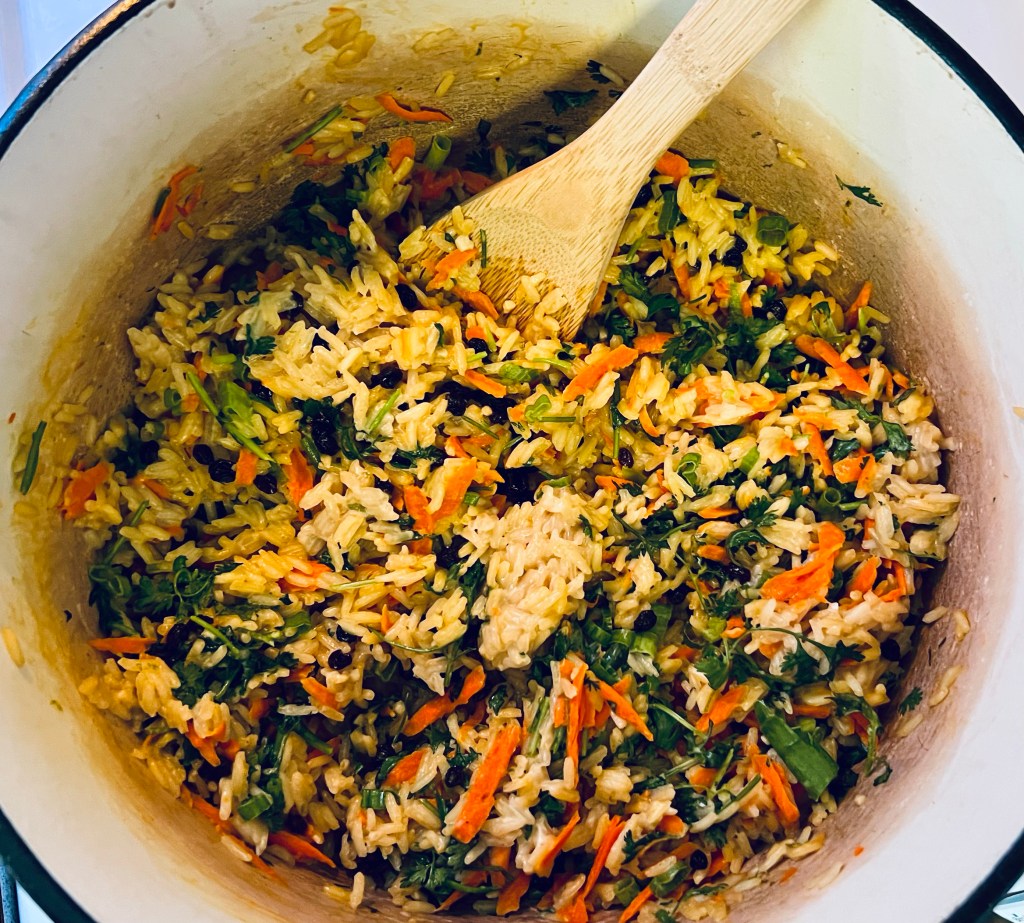 GET CHEFFY TIP!- As mentioned, this jeweled rice can have anything you like added to it. Pomegranate seeds and pistachios are common in Persian jeweled rice, so mix and match what you like, and what you think will look and taste best (the “jeweled rice police” will not come and arrest you if you add something unusual). When you add your item to your dish can be critical, however; notice that we added our raw carrot and dried currants to the rice as soon as the rice was done cooking, and allowed our carrots and dried currants 5 minutes in the heat to steam. We added our more delicate additions (like our cilantro and scallion greens), afterwards and did not allow them to steam in the rice. Consider this staggered approach when you add your items.
