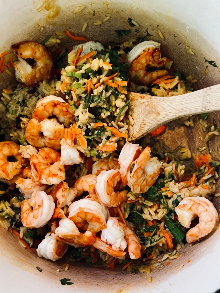 - After 10 minutes of simmering your rice over low heat, check it for doneness by tasting a few grains. 10 minutes will probably not be enough time to fully cook your rice through, so cover, and continue cooking over a simmer, checking every ~3 minutes until the texture of the rice is cooked through. Once your rice is cooked, but still Al dente, turn off your heat, and add your grated carrot, and dried currants. Gently stir to combine, and recover your rice, with the heat still off, for about ~5 minutes to let your vegetables and rice steam together. After 5 minutes, gently stir in your cilantro, scallion greens, lime zest, and shrimp. Serve with Sriracha, sesame seeds, chopped peanuts, or any other garnish.